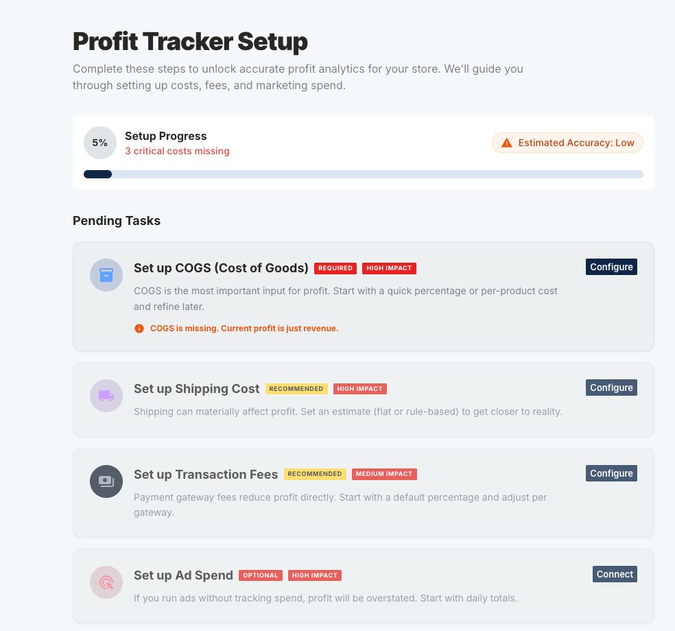 The Profit Setup Checklist is a guided, step-by-step system that helps you configure the costs that actually matter — without overwhelming you.
